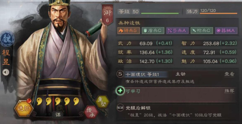 夏侯惇在游戏中定位为半肉半输出的骑兵武将,自带战法刚烈不屈是其核心价值。该战法提供统率加成和群体反击效果,触发概率40%,满级反击伤害率达84%。兵种适性以骑兵最优(S级),盾兵和枪兵次之(A级)。属性成长均衡,武力、统率突出,速度中等,智力无明显短板,适合承担前排抗伤兼输出的角色。