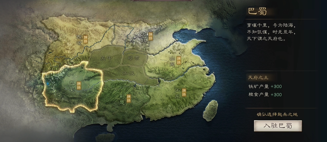 出生地的选择直接影响玩家前期的资源获取和兵种优势。游戏提供六个出生州,分别是河北、西凉、巴蜀、荆楚、江东和山东,每个州都有独特的资源加成和兵种增益。河北侧重枪兵伤害和名声值,西凉提升骑兵移速和铁矿产量,巴蜀以铁矿和粮食高产著称,荆楚增加铜币和木材收益,江东强化弓兵伤害和名声值,山东则增强盾兵承伤和木材产量。