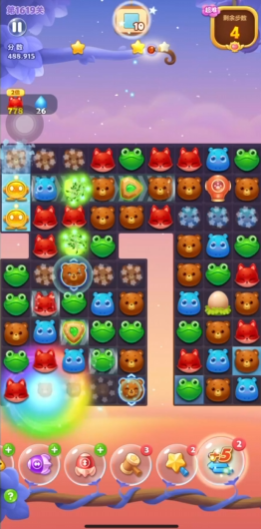 右下方的雪块和鸡窝是这关的主要难点。当顶部魔法石触发右上方的魔法炮特效时,会同时消除右下方的雪块和鸡窝,这时候会释放出大量小黄鸡。咱们要抓住机会快速消除这些小黄鸡,这样才能激活关卡中的染色宝宝。激活一对染色宝宝后立即交换它们,能产生全屏清除效果。左侧区域要多组合横向特效,底部挨着雪块的消除要优先处理。