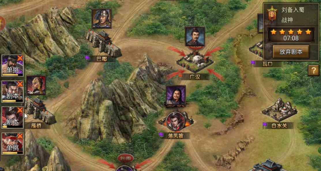 进入副本后,先让典韦去广汉刷4个影子,马超去瓦口刷2个影子,许褚和魏延跟进单挑。单挑胜利后记得及时撤退补血,别让武将一直打到死。残血的武将可以用来突进刷影子,每个城至少刷3个影子,防止武将上阵后无法单挑突进。突进的时候尽量一个个来,别一股脑全上,避免浪费兵力。战神难度下,涪城的事件NPC点击后,雒城会被攻击,所以提前在雒城刷够影子,至少3个以上比较保险。