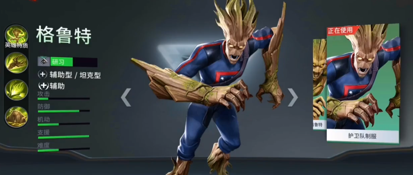格鲁特作为漫威超级战争中T0级别的辅助英雄,凭借其强大的控制能力和生存能力成为团队核心。其核心优势在于被动技能生生不息,阵亡后会化为小树人为队友提供护盾,同时一技能树人突袭的抓取效果和二技能枝叶拍击的群体击飞能有效打乱敌方阵型。需出装时应避免选择梅金腰带这类重复被动回血的装备,优先考虑死神幻影等增强团队容错率的装备。