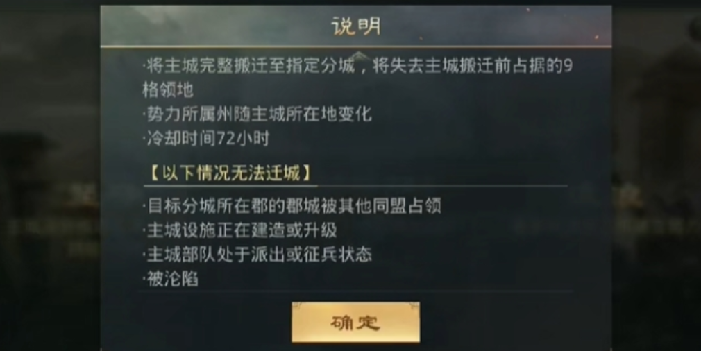 打开游戏主界面,点击右下角的内政按钮,进入政务选项就能看到迁城功能。选择目标分城后,系统会弹出确认界面,支付500玉符并通过简单的验证步骤即可完成迁移。新主城位置的土地不再提供资源产出,也不会计入势力值计算,所以选址时要优先考虑战略位置而非资源储备。如果目标分城所在郡的郡城被其他同盟占领,或者主城处于沦陷状态,系统会直接禁止迁城操作。