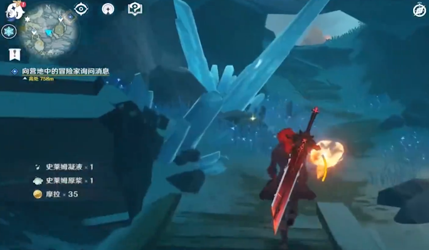 跳进地宫后,注意底部有个巨型冰晶,直接攻击是无效的。先找到周围散落的深赤之石(红色矿石),打碎后拾取buff再攻击冰晶才能造成伤害。洞里只有三块深赤之石,但冰晶血量较高,这时需要找两个仙灵帮忙开门。第一个仙灵就在地宫下层显眼位置,第二个藏在雪堆里,用火元素角色(比如安柏)融化雪堆就能解救它。