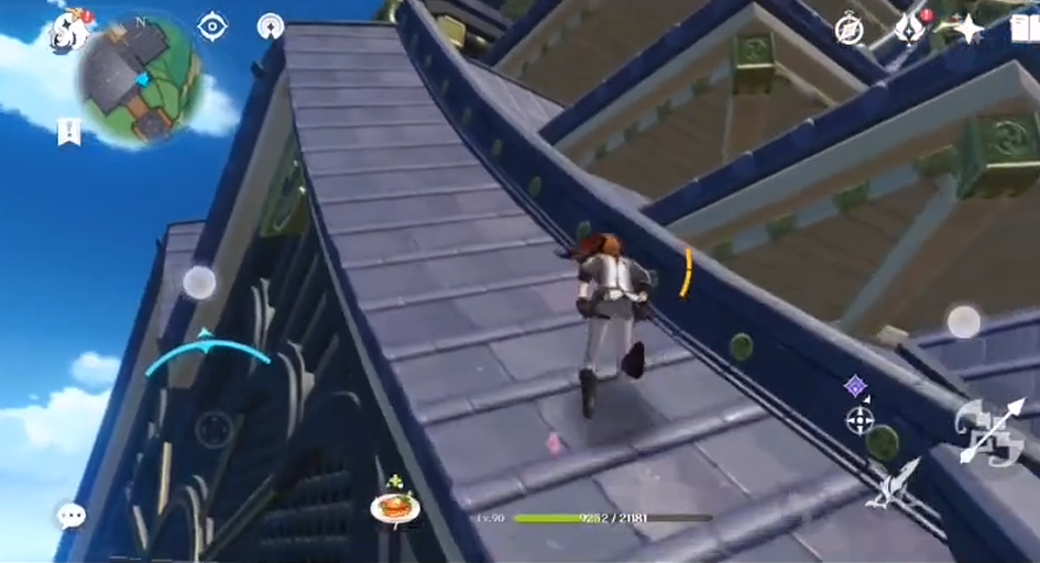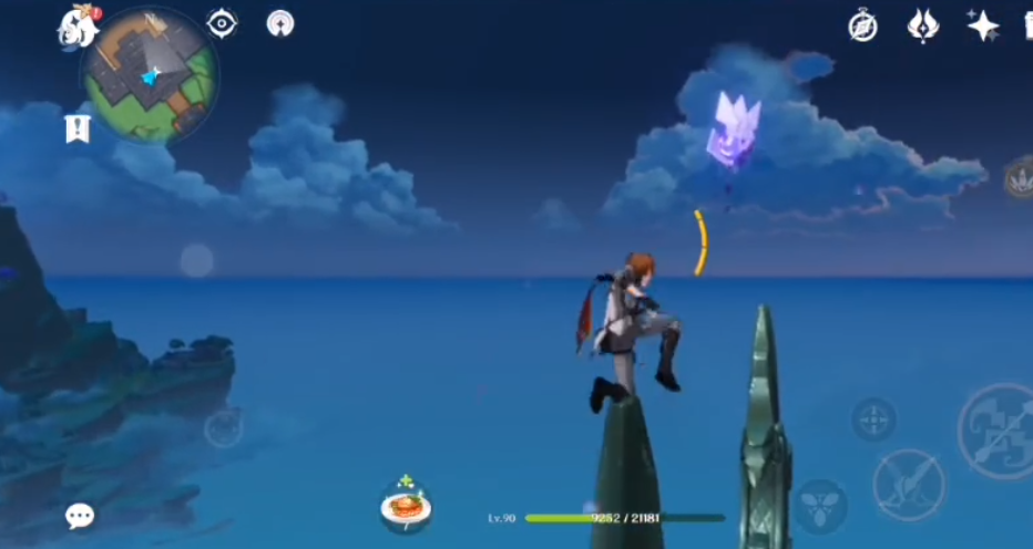 爬到对面房子的屋顶后,咱们就离目标不远啦!这时候如果是用捕风瓶的话,等它冷却结束,往雷神瞳的方向飞就能拿到了。要是带了温迪,直接用技能飞起来就行。雷神瞳就在头顶,稍微调整下角度就能轻松入手。