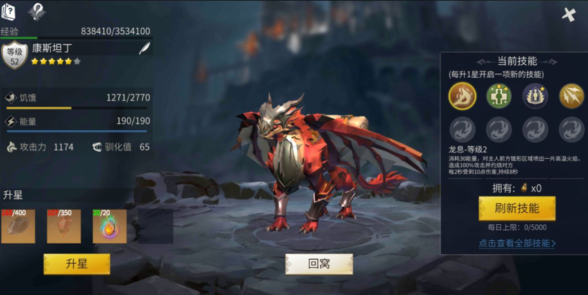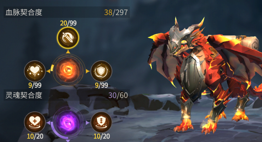 火龙的技能体系分为主动与被动两类。被动技能中,温顺提升驯化值,龙力增加攻击力,饥饿扩展饱食度上限,能量亲和提高能量储备。主动技能龙息可对锥形范围造成群体伤害并附加灼烧效果,龙弹则是单体高爆发技能,烈焰焚城属于大范围AOE技能。加点时需注意能量消耗与冷却时间的平衡,例如龙息消耗20能量冷却30秒,龙弹消耗5能量冷却15秒,实战中需根据副本需求灵活搭配。