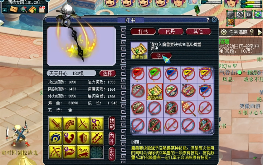 针对高级合纵的顶书操作,优先选择技能冲突较小的兽诀。根据实战测试,高级必杀与高级合纵存在明显冲突关系,可作为顶替首选。实际操作中需避免使用隐身、鬼魂等顽固技能垫书,这类技能后期难以覆盖且可能干扰战术体系。