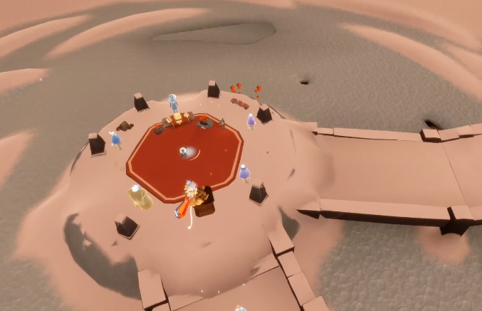 该区域冰层较薄,持续站立会引发冰面破裂效果,破裂后露出下方的荧光水潭。冰场边缘存在两处需要双人协作的机关,分别是冰墙封印的洞穴与可移动的冰柱。前者需两名玩家同时点燃门前蜡烛并完成打坐动作,后者要求玩家配合推动冰柱填补路径缺口。这些机关解谜成功后,可获取被封印的光之翼与季节蜡烛奖励。