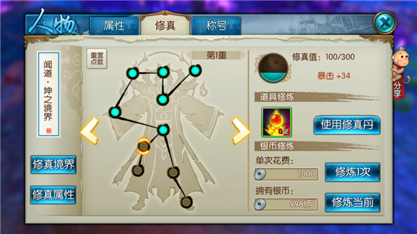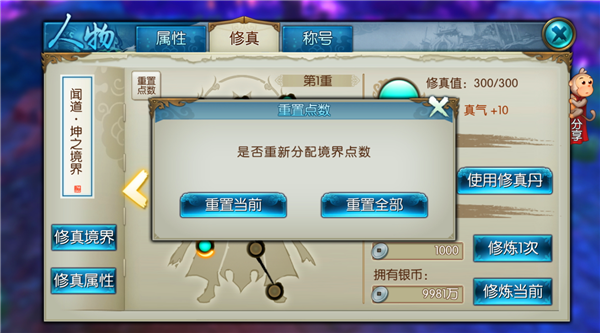 修真点数如果加错了也不用担心,游戏提供了重置功能,可以选择重置当前重数或全部重数,之前消耗的银币会变成修真丹返还。不过重置会花费不少时间,所以建议亲们一次性考虑清楚再加点。修真系统是提升道法的重要途径,通过合理加点可以让角色在各种战斗场景中都能游刃有余,无论是PVE刷本还是PVP对战都能有不错的表现。