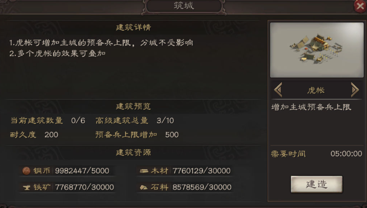 提升建筑总量的核心在于合理规划名声值与高级建筑分配。个人高级建筑分为造币厂、营帐、工坊、虎帐、仓库、乐府、拒马、箭塔和分城九种,但总量上限为10个(不包括拒马、箭塔等)。每个建筑类型有独立上限,例如造币厂、工坊、虎帐和仓库最多8个,乐府最多3个。提升建筑总量的关键是提高名声值,名声通过完成主线任务、霸业任务或随时间自然增长获得,每小时增加10点。初期6000名声可建1个造币厂,每增加2000名声多建1个,2万名声时可达8个造币厂上限。