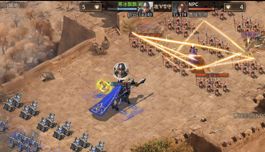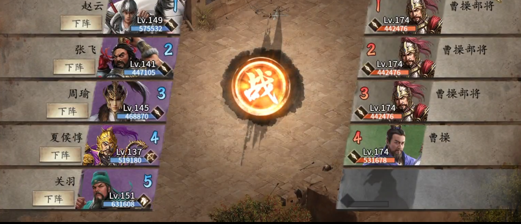 战斗开始时先用太史慈这类带抵挡技能的武将首发,尽量在前两回合抵挡住敌方战法。第二位上场的武将建议选择关羽,五车配置不带副将,配合开山旗子能打出高额斩杀。注意观察敌方战法释放时机,在NPC放技能前及时使用固若金汤或金汤技能减伤。周泰带孙坚副将时记得堆到70级阵法,三个八级步兵克制能大幅提升生存能力。