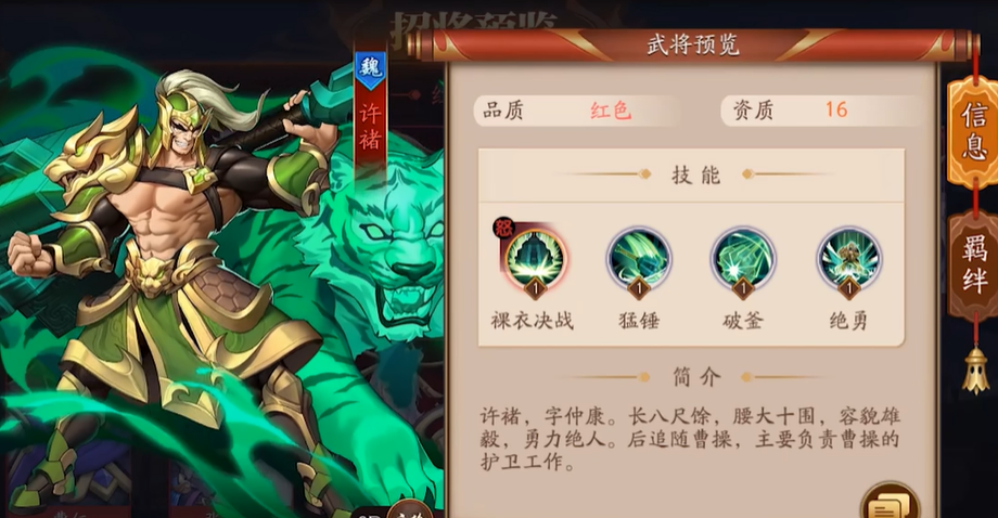例如面对高爆发队伍时,可优先选用许褚+曹操的双前排组合,搭配司马懿和郭嘉的双控场;若需速攻,则以张辽、典韦为核心,配合曹操的增益快速突破防线。红将的羁绊激活也至关重要,例如司马懿与张辽同时上阵可激活奇谋猛进效果,提升暴击率;许褚与典韦组合触发虎贲之勇,增强防御属性。羁绊加成能显著提升阵容整体强度。