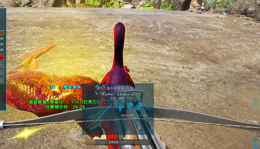 黄昏鸟的驯服方式较为特殊,需先击杀鱼类并将鱼尸拖至其面前交互喂食。剑池鲑鱼的驯养效果优于食人鱼和腔棘鱼,建议在河流区域建造三面栅栏围挡以限制其移动。该生物被驯服后可通过吞食鱼类产出金蛋或银蛋,金蛋可用于驯服羽暴龙或提供经验加成,银蛋则可炼制油脂。驯服时需注意黄昏鸟攻击性较强,引至陷阱前需保持安全距离。