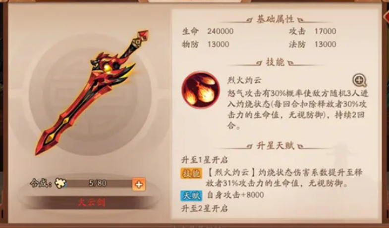 孙坚作为前排坦克兼输出,适合兼具防御和攻击的流星锤,既能吸收伤害又能反击;吕蒙作为残血收割者,佩戴诸葛连弩可增强收割效率,配合其技能实现连续击杀。鲁肃等灼烧流武将首选火云剑,叠加燃烧效果提升持续伤害。需注意神兵的基础属性如攻击、暴击、命中需根据敌方阵容调整,例如面对高闪避敌人时优先选择命中加成的神兵。