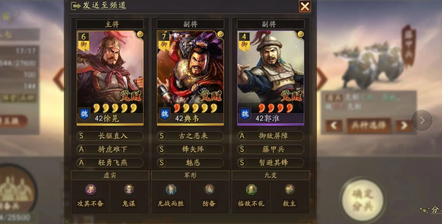 徐晃战法,像轻勇飞燕、横扫千军这种能打多次兵刃伤害的战法就特别适合他,可以快速触发叠加。另一个神技是骑虎难下,当队友受到普攻时,徐晃就能对敌方全体发动反击,这个战法和典韦的保护机制简直是天作之合,能打出非常稳定的范围伤害。曹仁,他的战法选择就围绕更硬和更多控制来。魅惑是一个常见选择,配合他自带的嘲讽,每次挨打都有机会让攻击者陷入混乱、计穷等负面状态。合军聚众或者自愈这类自带回血的战法能提升他的续航,让他站得更久。如果你有顶级的防御战法如抚辑军民、藤甲兵给他,队伍的肉度会再上一个台阶。典韦的战法则主要强化,增强他反击时的输出,比如带气凌三军或后发制人;进一步提升他的生存或辅助能力,比如带锋矢阵来给主将徐晃增伤,或者带虎卫军来激活缘分特技并强化自身。