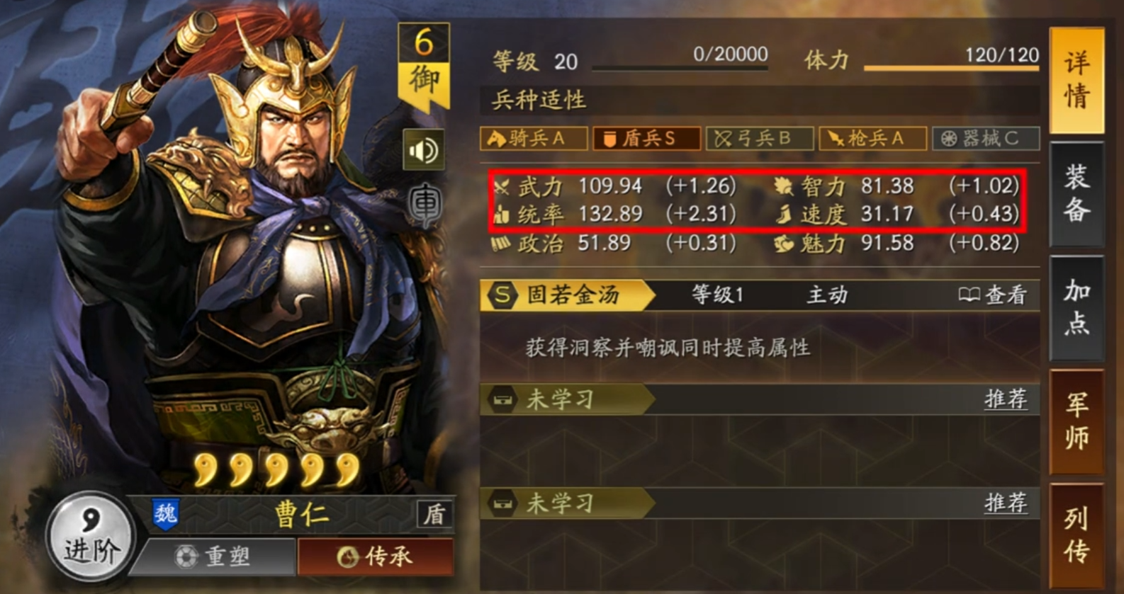 徐晃全加武力,最大化输出。曹仁作为主坦,通常推荐全统率加点,让他更耐揍;如果你给他带了魅惑这类吃智力的控制战法,也可以适当分一些点数给智力。典韦的加点相对灵活,为了保证他的生存能力以持续保护主将,主流是加统率。兵种选择上,三人盾兵适性都不错,所以陷阵营或藤甲兵是常见的选择。陷阵营提供前几回合的急救和武力加成,比较均衡;藤甲兵对兵刃伤害的减免效果极其显著,堪称物理队的克星,但缺点就是非常怕火,遇到带火的队伍容易吃大亏。兵书给徐晃点出攻其不备和将威来追求爆发,给曹仁点守而有道和刚柔来加强减伤和治疗效果。