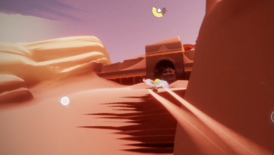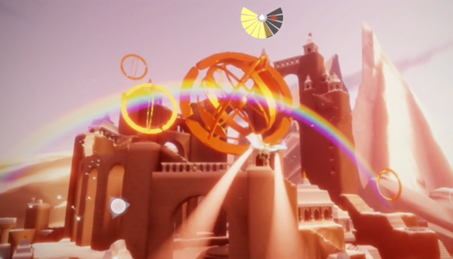 接下来就是最关键的一步:蜡烛到底藏在彩虹下的哪个角落呢?你飞近彩虹后仔细观察,在彩虹的右端,也就是彩虹落下来的那一头,地面上会有一个圆形的、像古代天文仪器一样的装置,有的攻略里叫它天体仪,有的叫它经纬仪或者地动仪。这个旋转的圆球仪器就是最准确的定位标志。你要找的那一堆大蜡烛,既不悬在空中,也不藏在屋顶,它就老老实实地待在这个小天体仪的下方、紧贴着彩虹右端尽头的地面上。