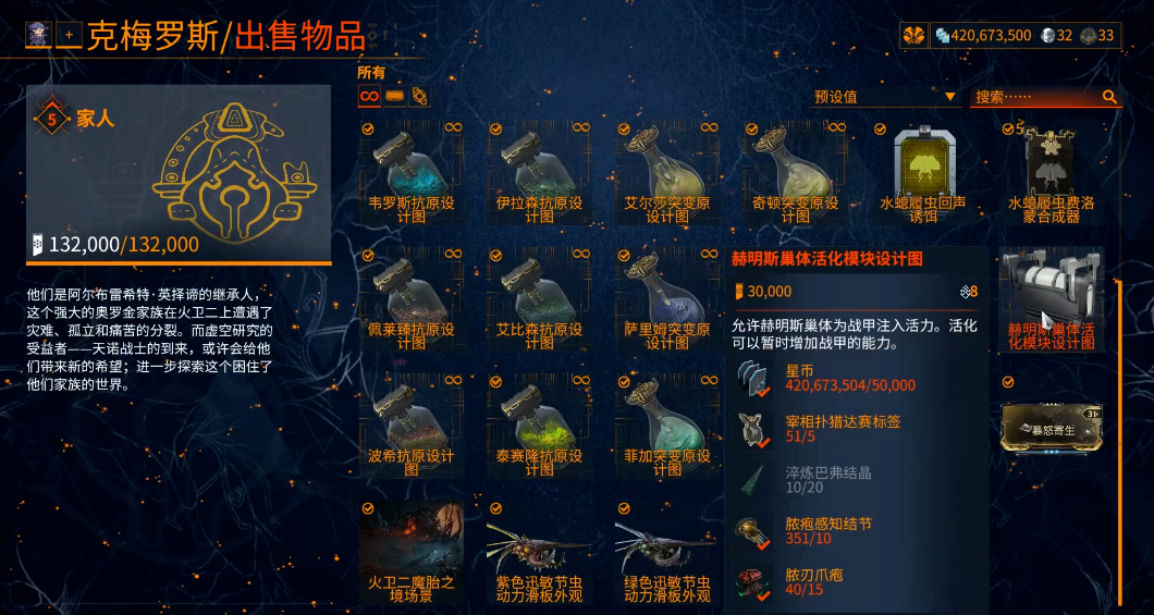 当你的英择谛声望达标后,去殁世幽都找到名叫儿子的NPC,在他那里可以用一万五千点声望兑换到一个关键的物品——赫明斯模块蓝图。兑换成功后,蓝图会进入你的飞船铸造仓,记得准备好所需的材料进行制作,制作过程需要等待一段时间。模块制作完成后,下一步就是去安装它了。回到你的轨道飞行器,走到军械库左边下楼,进入那个充满感染体组织的房间,你会看到中央那个被触手环绕的椅子。靠近椅子并互动,选择安装你刚刚制作好的赫明斯模块。安装过程中,系统会提示你给这个新激活的赫明斯起一个名字,起完名之后,整个大嘴系统就算正式对你开放了。