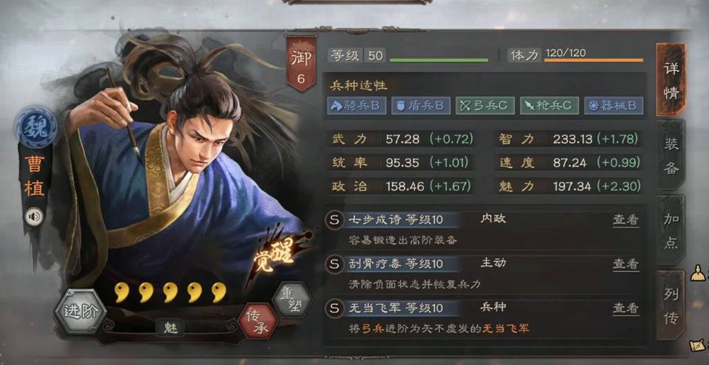 曹植的特点就是智力属性很高,适合站在后排当辅助或者输出手。曹植的核心价值就在于智力加成和治疗能力,搭配合适战法能让他更稳地帮队伍扛伤害或回血。游戏里每个武将的战法槽位有限,所以得精挑细选,确保他的智力优势发挥到最大。