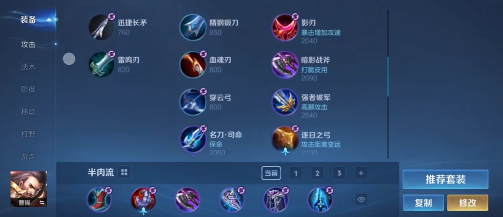 边路曹操的出装顺序通常为抵抗之靴、暗影战斧、反伤刺甲、宗师之力、破军以及名刀司命或贤者的庇护。抵抗之靴减少控制时间,暗影战斧提供冷却缩减和穿透,反伤刺甲增强对线抗压能力,宗师之力强化普攻爆发,破军提升收割残血的能力,而名刀或复活甲则作为保命装备提高容错率。这套出装兼顾了高输出和生存能力,让曹操能在团战中持续输出并回复生命。装备成型后,曹操能轻松切入后排,秒杀脆皮英雄。