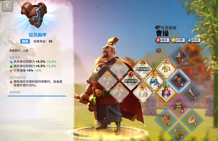骑兵天生攻击高但身板脆,散件搭配要像搭积木一样填缺口。如果野战发现战损过大,优先检查生命值是否低于21%,防御是否不足15%,不够就调整散件补属性。攻击属性靠炼狱套和天赋已经足够,额外堆攻击的收益远不如补防御或生命。记住一个口诀:攻击达标看套装,身板不足散件凑。