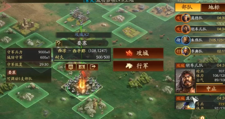 当部队因紧急接敌或其他原因,不得已进行了消耗士气的普通行军后,及时恢复士气是补救措施。恢复士气的主要方式是让部队在非行军状态下停留,部队停留在任意地点,包括野外,都会随时间缓慢恢复士气。另一种更快的办法是让部队返回己方的城池或营帐,一旦抵达,士气会立刻补满。这就强调了作战节奏把控的重要性,如果你预计将有一场硬仗,务必提前计算好行军距离和时间,要么通过调动抵达,要么提前到达战场附近寻地驻扎,等待士气回满后再发起进攻,避免以低士气状态投入战斗造成不必要的战损。