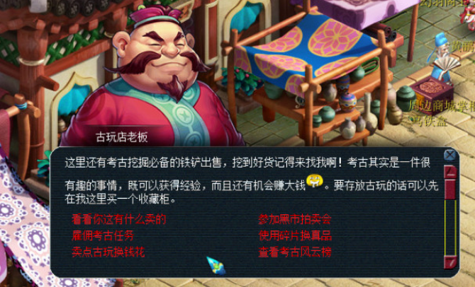 考古是一项生活技能玩法,允许玩家通过挖掘古董来获得游戏内收益和体验文化元素。玩家需要达到一定等级后,在古玩店老板处购买考古宝盒,开启后获得罗盘和考古铲等工具,用于传送到指定地图进行挖掘,可能产出赝品、高仿品、真品或稀世珍品等不同品级的古董,每件物品根据品级和稀有度具有不同的价值,是游戏内金币与银币转换的重要途径之一。