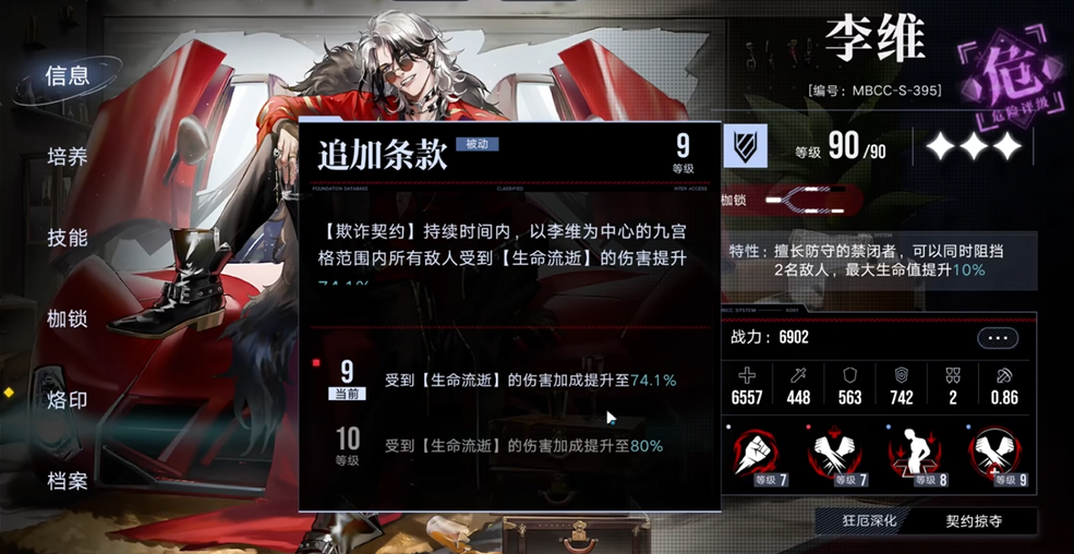 李维的技能组紧密围绕生命流逝展开。其必杀技欺诈契约在开启后的12秒内提升自身法抗,奠定其法术特化型坦克的基石。核心被动合同陷阱使其在受到伤害时,有概率为攻击者附加基于李维自身法抗属性的生命流逝标记,实现受击反击。另一被动增加条文则会在必杀技持续期间,强化以其为中心的九宫格范围内所有敌人受到的生命流逝伤害,这是一个全局性的伤害增幅效果。他的专属烙印进一步放大了团队收益,能根据目标身上携带的、由不同角色施加的生命流逝状态种类数,来提升该目标受到的伤害,这意味着队伍中生命流逝的来源越多,李维提供的增伤就越可观。
