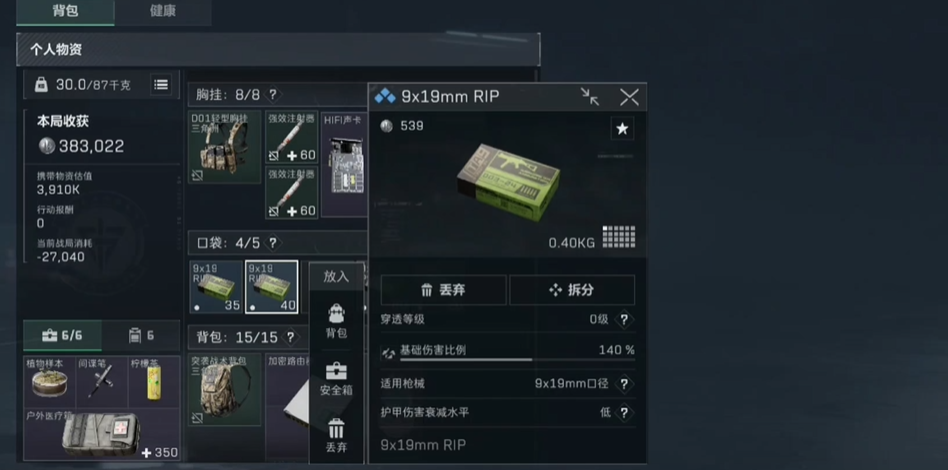 0级弹是一种穿透等级为0级的9x19mmRIP弹药,其最核心的特性是完全无法穿透任何等级的护甲。这意味着无论敌人穿戴的是低级还是高级防弹衣,0级弹都无法直接击穿护甲对敌人的肉体造成伤害。作为一种特化弹药,它拥有高达130%的基础肉体伤害系数,这使其对无护甲防护的身体部位能造成显著的高额伤害。