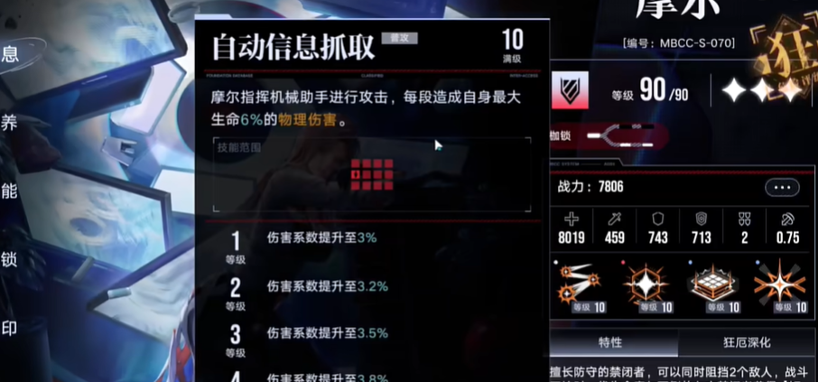 摩尔是一名坚韧特化型禁闭者,定位为防御辅助角色,她的技能围绕矩阵护盾系统展开。摩尔通过机械助手进行普通攻击,造成基于最大生命值比例的物理伤害。必杀技动态防御矩阵可以为友方单位构建矩阵,提供护盾保护,并在对已有矩阵单位重复使用时,对周围敌人造成物理伤害和核心伤害。被动技能紧急服务熔断能扩展矩阵范围,使友方免疫控制效果,而主动防御系统让矩阵每秒对范围内敌人造成伤害。专属烙印界线则进一步提升范围内友方的物理伤害输出,使她在攻防两端都有不错的表现。