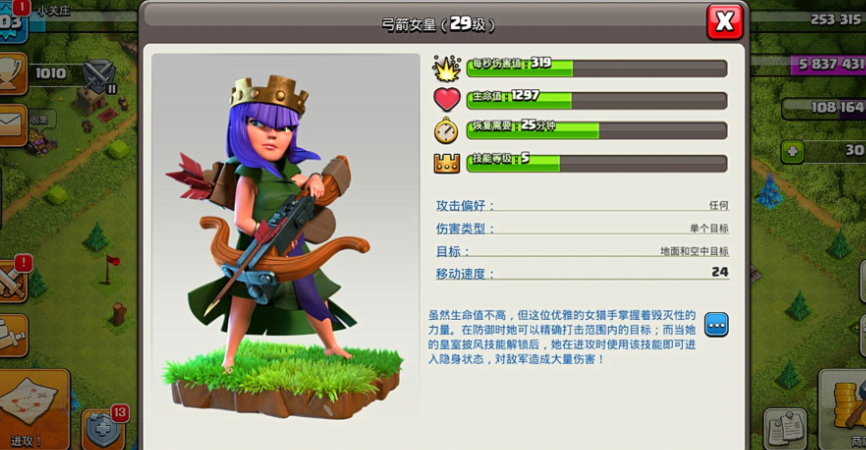 弓箭女皇是至关重要的英雄单位,她在九本阶段解锁后成为进攻的核心力量,凭借远程攻击和独特技能在战斗中发挥关键作用。她的治疗光环能为周边部队提供持续生命恢复,而强力攻击技能则可以瞬间对防御建筑造成高额伤害。合理运用女王能有效瓦解敌方阵型,尤其在部落战或资源掠夺中,她的存在常常决定胜负走向。玩家需要优先升级女王等级以提升基础属性,并熟悉她的技能机制来适应不同战斗场景。