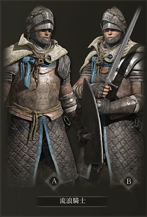 流浪骑士出身初始就拥有一块100物理减伤率的中型盾牌,配合防御反击动作对抗常规敌人非常安逸,骑乘下戟也能充分发挥距离和一击脱离的优势。初始装备包括长剑、戟和流浪骑士套装,但要注意装备重量较高,可能导致负重超过阈值无法正常翻滚,需调整或卸掉部分装备将负重维持在中的状态。