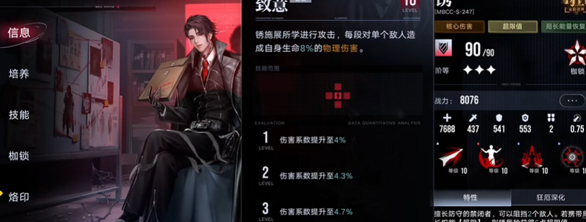 锈的核心价值在于其作为超限机制的先导者所具备的战略意义。他的技能设计围绕超限能量展开,能够为团队提供宝贵的易伤效果,这在高难战斗中往往是提升输出的关键。具体到技能培养,由于普攻的输出占比不高,建议升至5级即可;必杀和第一个被动技能直接影响爆发伤害,可以考虑到8级;而第二个被动技能作为核心的辅助手段,提供的易伤效果收益显著,是优先升级的对象,建议升至9级或10级。这种加点思路凸显了其辅助与爆发兼顾的定位。