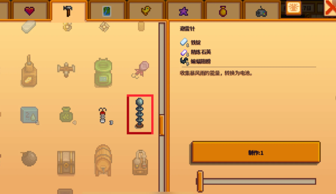 避雷针是咱们在农场里对抗雷雨天气的好帮手,不仅能保护作物和设备不被雷电破坏,还能顺便收集电池组。制作避雷针需要铁锭、精炼石英和蝙蝠翅膀,其中蝙蝠翅膀要准备五个,其他材料各一个。解锁条件是采摘等级达到6级,之后在制作面板的打造选项里就能找到它。