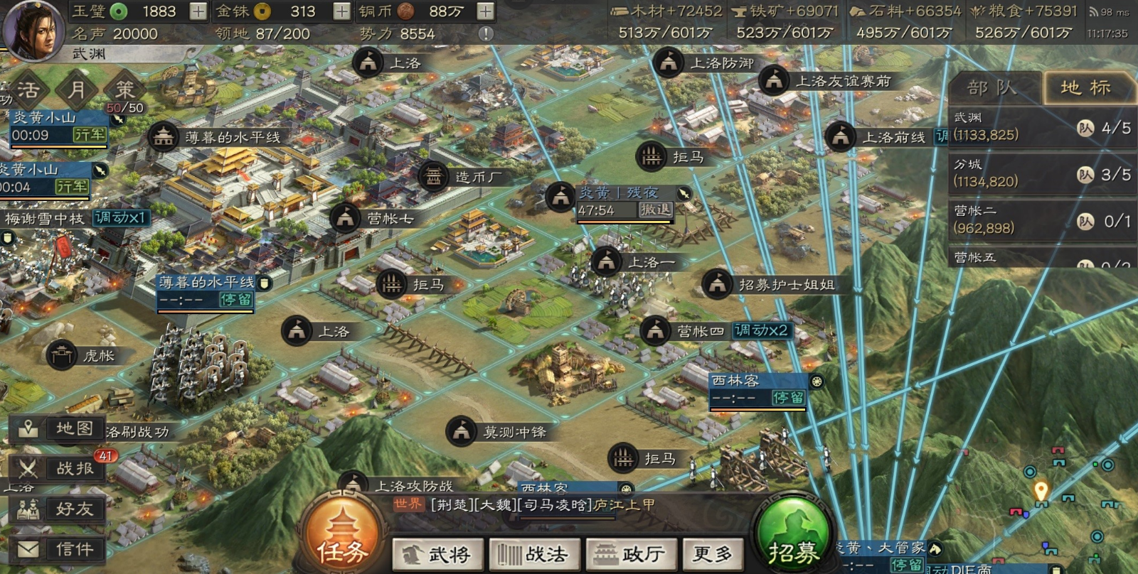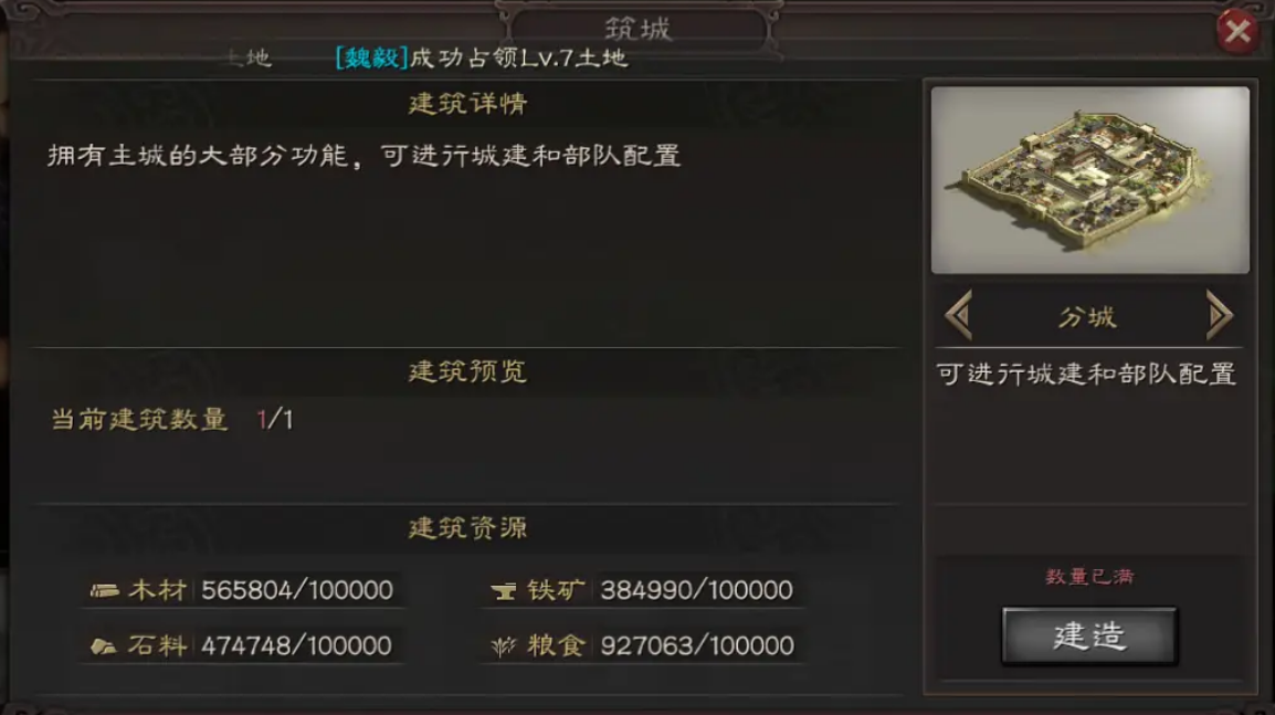 分城建造的首要条件是名声值达到6000点,这是解锁分城功能的基础门槛。其次需要占领11块连地的H型区域,其中中心地块必须为6级或以上等级土地。选址时需考虑周边资源分布与地形优势,优先选择资源丰富且易守难攻的位置。建造过程需消耗木材、铁矿、石料和粮食各10万单位,建造时间为5小时且不可加速。