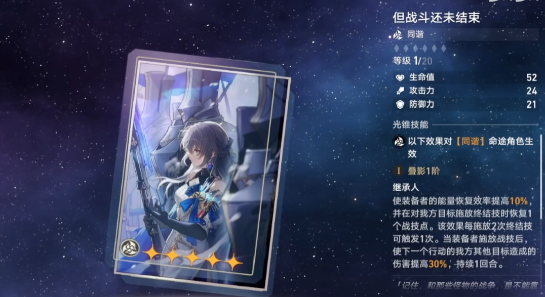 光锥选择上,五星首选但战斗还未结束,提供能量回复与战技点恢复,契合频繁释放终结技的需求;四星推荐记忆中的模样增强击破特攻与能量回复,或与行星相会专精火队增伤。遗器套装最优组合为流星追迹的怪盗四件套与生命的翁瓦克二件套,前者提升击破特攻与破盾回能,后者加速能量循环并提供开场行动提前。主词条选择暴击率躯干、速度鞋与火伤球,连结绳优先能量回复效率。副词条以速度、暴击率和击破特攻为优。