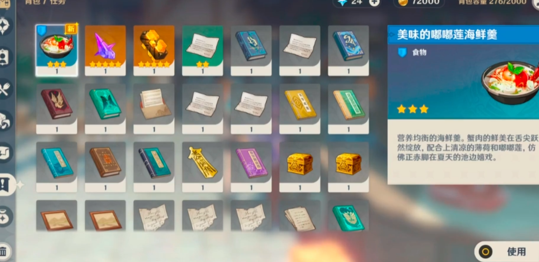 嘟嘟莲海鲜羹的烹饪材料包括螃蟹×4、嘟嘟莲×1、薄荷×2。螃蟹可通过提瓦特各水域的沙滩或浅水区采集,推荐鹰翔海滩、风龙废墟北岸等区域集中收集。嘟嘟莲主要生长在蒙德地区的清泉镇、晨曦酒庄周边水域,每日刷新上限为58朵。薄荷则广泛分布于风起地七天神像周围及达达乌帕谷,单次可采集200株以上。