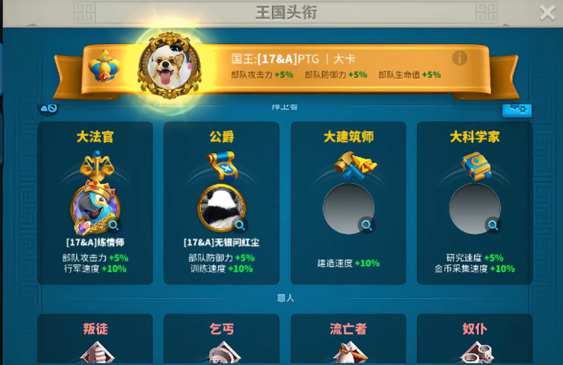 国王头衔是游戏内权力与战略资源的集中体现,由占领神庙的联盟盟主自动获得。这一头衔不仅象征统治地位,更赋予持有者多项直接影响王国发展的核心权限,包括分配臣属头衔、开启全服增益、管理移民战力上限等。国王能够通过委派爵位强化联盟成员能力,例如将王后头衔授予采集型玩家以提升15%采集速度,或任命元帅增强部队攻击与训练效率,形成明确的职责分工体系。