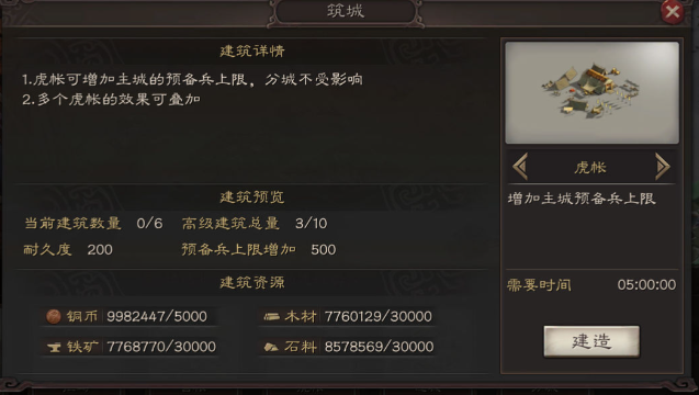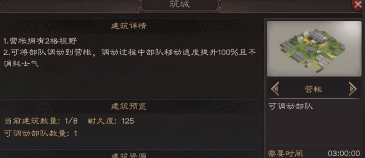营地的核心功能包括资源采集、部队休整与战略调度。通过占领周边资源地(石料、铁矿、木材、粮食)可维持资源供给,而营帐能为远离主城的部队提供2格视野和休整空间。建造时需消耗策书及基础资源,耗时较长但不可加速,因此需提前规划位置。营帐与主城或其它营帐间调兵不损耗士气,适合用于长途作战的阶段性补给。若需放弃已建营地,可通过资源信息窗口选择放弃功能,但会损失已投入资源。