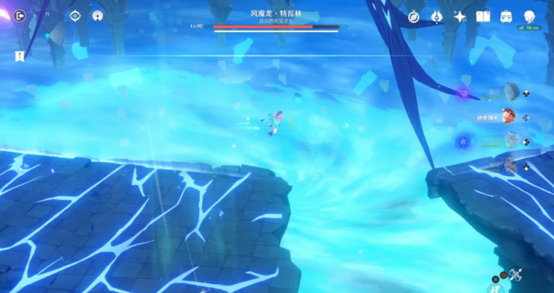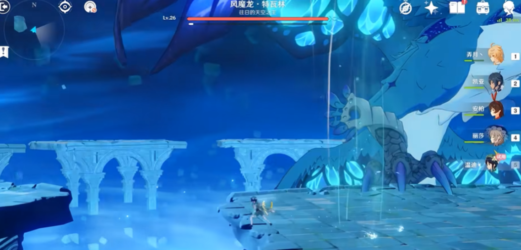 破盾后风魔龙会瘫在平台上,这时候赶紧爬到他脖子上攻击紫色晶体。单手剑攻速快,连招流畅,特别适合这种输出窗口短的场合。记得提前吃加攻击力的食物,比如仙跳墙,能大幅提升输出效率。如果觉得血量吃紧,可以带个诺艾尔开盾保命,或者用芭芭拉随时回血。风魔龙的吐息和终天闭幕曲伤害很高,看到它蓄力就立刻跑到平台另一侧,别贪刀。