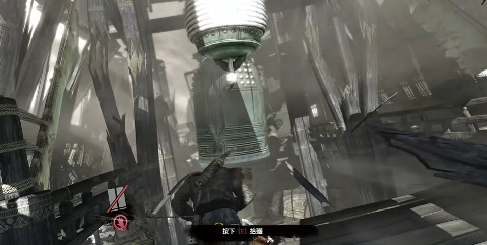 峡谷寺院的大钟谜题是游戏中的一个关键解谜环节。这个谜题需要玩家利用环境中的风力机制和钟摆的物理特性来破坏支撑结构,最终让大钟掉落砸穿地面。首先进入峡谷寺院后,会看到场景中央悬挂着一个大钟,两侧各有一扇可以开关的窗户。玩家需要先使用曲柄机关打开其中一扇窗户,让强风吹动钟摆。按鼠标滚轮键发射绳索箭,将钟摆拉向风口方向,借助风力让钟摆撞击支撑大钟的木柱。撞击力度不足时,可以反复拉动绳索增加摆幅。