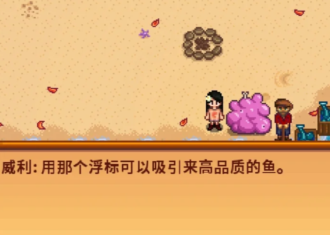 拿到优质浮标,首先得完成威利的特别订单需要多汁的虫子。这个任务会触发一段剧情动画,之后威利就会把制作配方送给你。配方需要1个铜锭、20个树液和5个太阳精华,材料不算难找,铜锭用铜矿石烧制,树液砍树就能掉,太阳精华打矿井里的幽灵或者太阳能精灵就有机会掉落。
