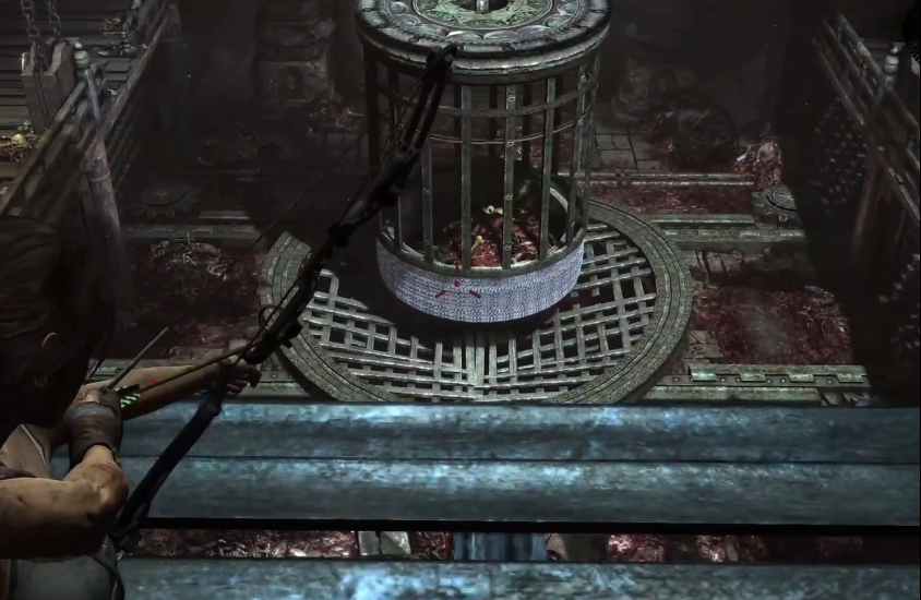 爬到二层平台后,会发现一个隐藏的短梯通向三楼。在三楼中央位置,用弓箭对准铁笼的绳索再次射击,趁它朝你摆动的瞬间跳上去。这里需要手速快一点,等铁笼荡到最高点时,抓住时机跳到对面平台。如果第一次没成功,多试几次调整跳跃节奏。注意笼子必须保持下降状态,升起来反而会卡住进度。