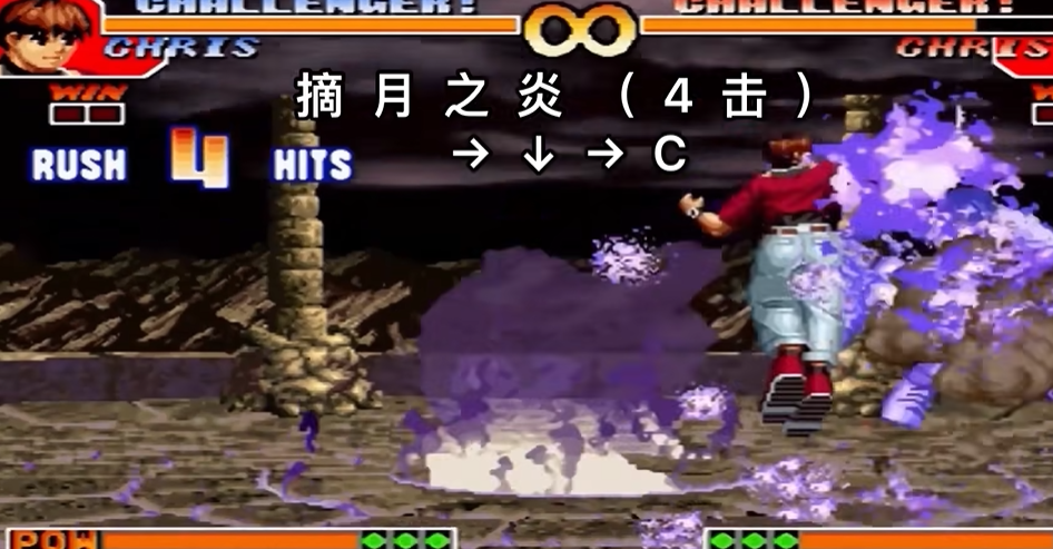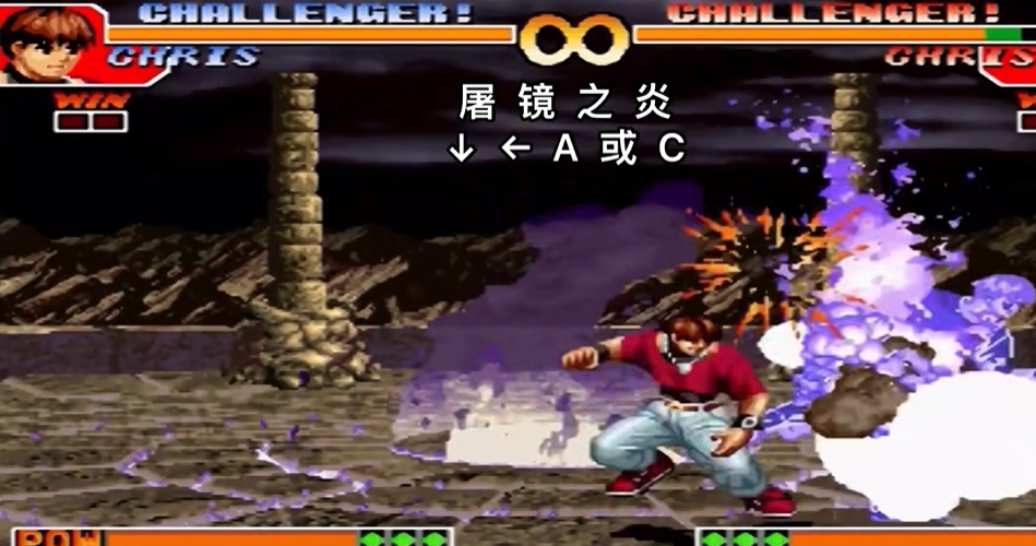 克里斯的普通技能衔接是大招成功释放的基础。射日之炎(↓↘→+A/C)和屠镜之炎(→↓↘+B/D)能快速拉近距离,建议先用射日之炎起手,接屠镜之炎突进,最后用暗黑大蛇薙收尾。注意噬肢之炎(近身→↘↓↙←+A/C)是投技,命中后可强制倒地,为后续大招创造机会。
