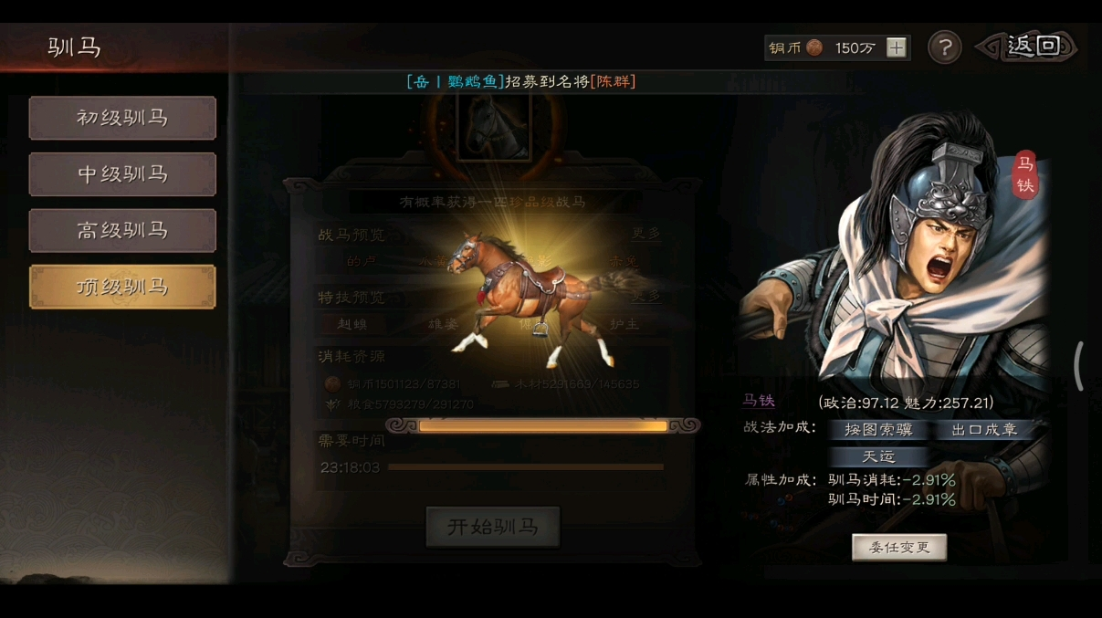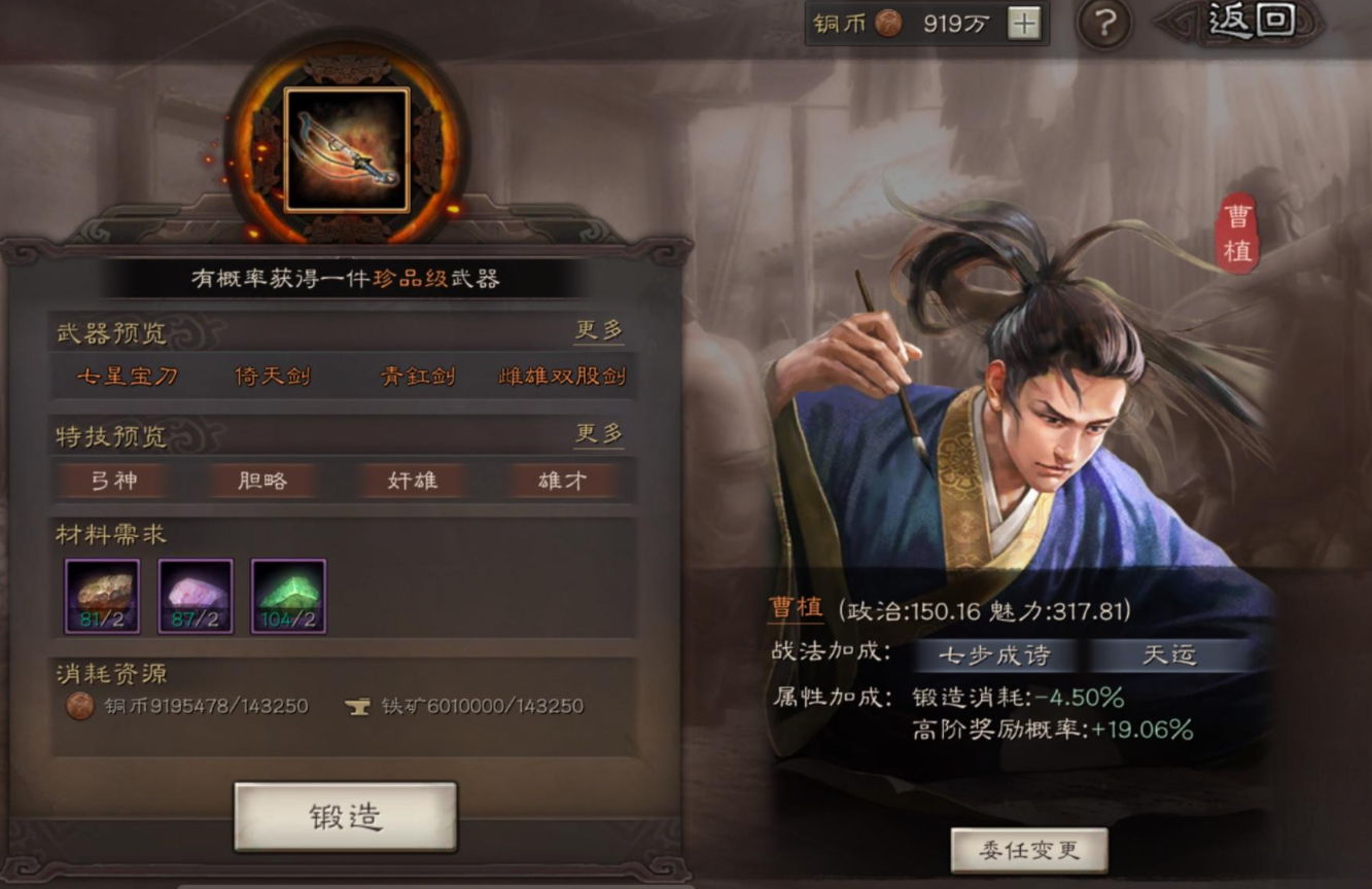 中期开始要注意特殊内政岗位的配置。锻造官曹植能降低装备打造消耗,驯马官则需要魅力值高的武将提升良马产出概率。主政官位置推荐用张昭或曹丕,前者增加全资源产量,后者缩短建筑时间。记住内政武将不需要进阶加红,重复的武将拿去拆战法更划算。资源溢出时可以考虑集中锻造或驯马,这时候高阶产出概率比节省资源更重要。