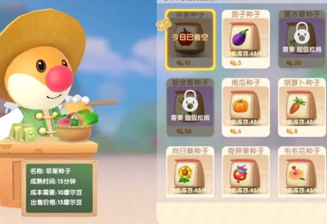 偷别人的特产,首先得知道哪些是特产。每个小摩尔进入庄园后都会随机抽到一种植物特产和一种鱼类特产,植物特产可能是苹果、水蜜桃、葡萄、草莓或香蕉,鱼类特产则包括狗鱼、金鱼、锦鲤、小龙虾或大闸蟹。这些特产在自家商店买不到种子,只能去别人家偷偷摘或者钓。