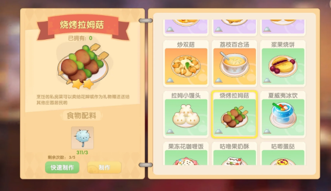 烧烤拉姆的制作流程相对简单,无需预先研究菜谱或提升厨师等级。玩家在收集足够原料后,可直接在餐厅的烹饪界面选择该食谱进行制作。每份烧烤拉姆的制作耗时约两分钟,单次最多可产出15份成品。该菜品在餐厅经营中属于基础类料理,虽然单份售价仅为5摩尔豆,但由于制作效率较高且原料易得,适合作为游戏前期积累资金的稳定收入来源。