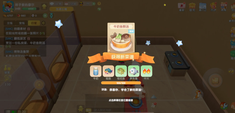烹饪牛奶鱼群汤时,火候是关键,记得调成中火。把牛奶和三种鱼一起放进锅里,耐心等待30分钟,美味的鱼汤就完成了。如果火候不对或者食材放错了,可能会失败,所以一定要按照配方来。研究菜谱时,如果厨师等级不够,即使材料正确也可能无法解锁,所以平时多练习其他料理提升等级很重要。