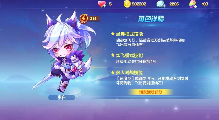 李白这个角色发动御剑飞行就能向前冲刺,冲刺的时候你按住跳跃键还能消耗灵力放出万剑诀,天上掉下剑雨把路上的障碍物都打坏,并且爆出高分的狐仙石飞币,捡到这些飞币分数一下就上去了。他有个灵力条,用技能会消耗灵力,但灵力会自己慢慢恢复,所以不能乱用,等灵力攒多些再放技能效果更好。李白在经典模式里是三段跳加滑翔的操作,跑起来手感比较流畅。