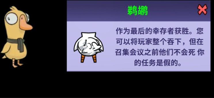 被鹈鹕吃掉的玩家并不会立即死亡,而是会进入鹈鹕的肚子里继续存活,直到会议被召开时,这些被吞食的玩家才会结算死亡;如果鹈鹕在会议前被击杀,则被吞食的玩家会被全部释放。鹈鹕的吞食范围通常比常规的刀人范围要长,但其吞食技能存在冷却时间,且每成功吞食一人,后续的冷却时间会相应增加。鹈鹕的获胜途径主要有两条:其一是通过吞食行为,令场上所有其他存活玩家都被纳入腹中,从而实现独自获胜;其二是当游戏进行到最后,场上仅剩鹈鹕与另外两名玩家时,会进入特殊的鹈鹕时刻,在此倒计时阶段鹈鹕若能存活至结束,也能取得胜利。鹈鹕的玩法侧重于隐蔽地控制人数,并通过吞食关键角色来逐步掌控局面。
