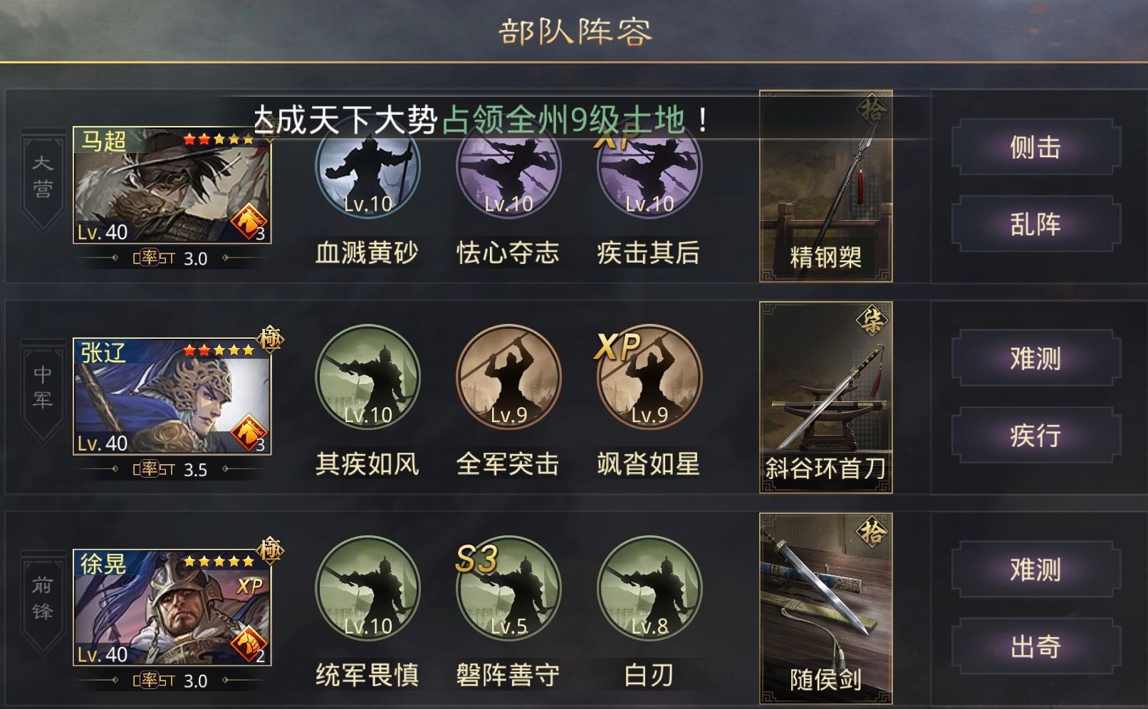 阵容战法搭配是兵力持平的关键支撑,阵型分布需要做到攻防均衡,前锋携带一夫当关、健卒不殆、磐阵善守这类前排减伤战法,最大化承伤扛伤,稳住前排兵力损耗节奏;中军搭配浑水、妖术等控制软减伤战法,干扰敌方输出节奏,不会出现爆发伤害打破兵力平衡;大营选用楚歌四起这类平稳持续输出战法,搭配重整旗鼓、三军之众续航恢复技能,压低爆发上限、补齐队伍血线,让敌我双方兵力损耗速度完全同步,不会出现单边快速减员的情况。兵种转置选择禁卫、重甲防御兵种,进一步降低全军受到的兵刃伤害,配合阵营兵种属性加成,细化攻防差值,让兵力持平的效果更加稳定。